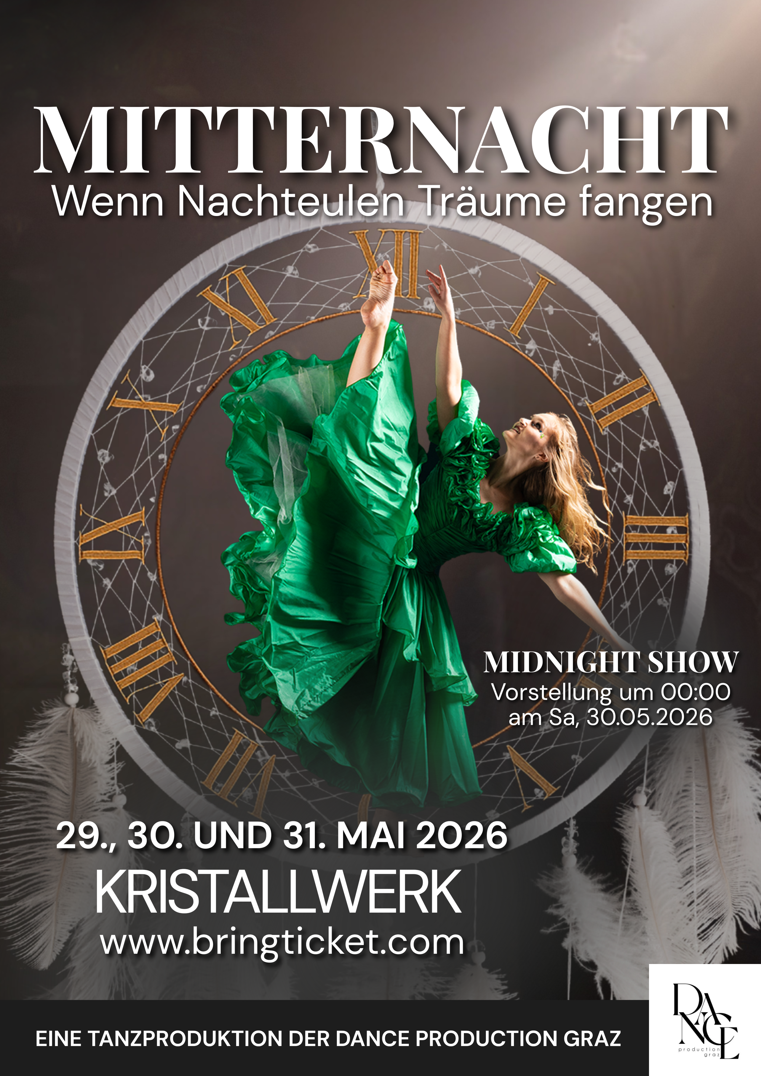 TANZTHEATER. Es ist die Stunde, in der die Welt zur Ruhe kommen sollte – doch nicht alle finden Schlaf. Wenn die Uhr zwölf Mal schlägt, öffnet sich das Tor zur Mitternacht, und jene, die noch wach sind, beginnen ihre Reise durch die Schatten der Nacht. Nachteulen wandeln durch Zimmer und Gedankenlandschaften. Sie werden verfolgt von Träumen, getrieben von Sorgen, gefangen zwischen Wunsch und Wirklichkeit. Die Dance Production Graz taucht in diese magische Stunde ein und vertanzt sie aus vielen Blickwinkeln.